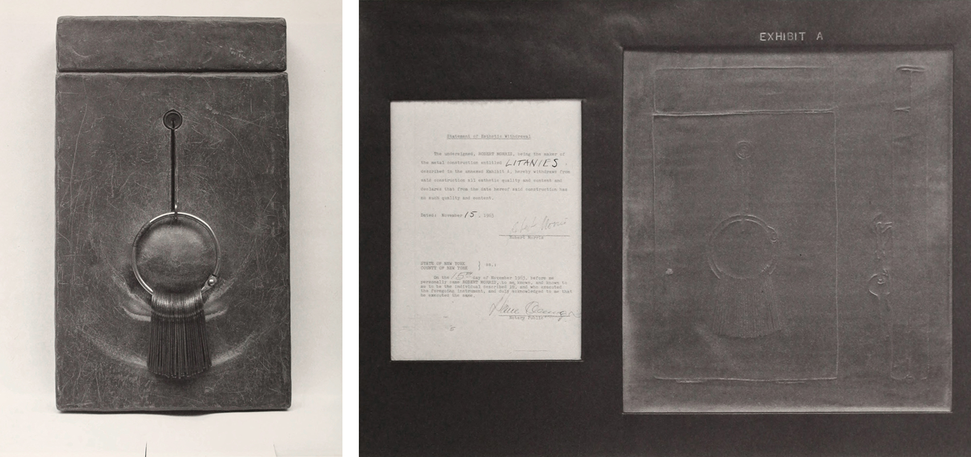 Morris, much earlier, having created Litanies (1963), a lead-over-wood wall piece, bearing a ring hung with twenty-seven keys (each inscribed with a word from a text by Duchamp), riposted to Philip Johnson, who still owed him money for the work, with Document: a legal text ratifying a “statement of aesthetic withdrawal” mounted next to lead-covered “ghost” of the original work [fig. 4a & b]. Can aesthetic qualities indeed be “withdrawn” from a work by an artist’s act of will — as the sacredness of the host is “withdrawn” by an unbeliever?
