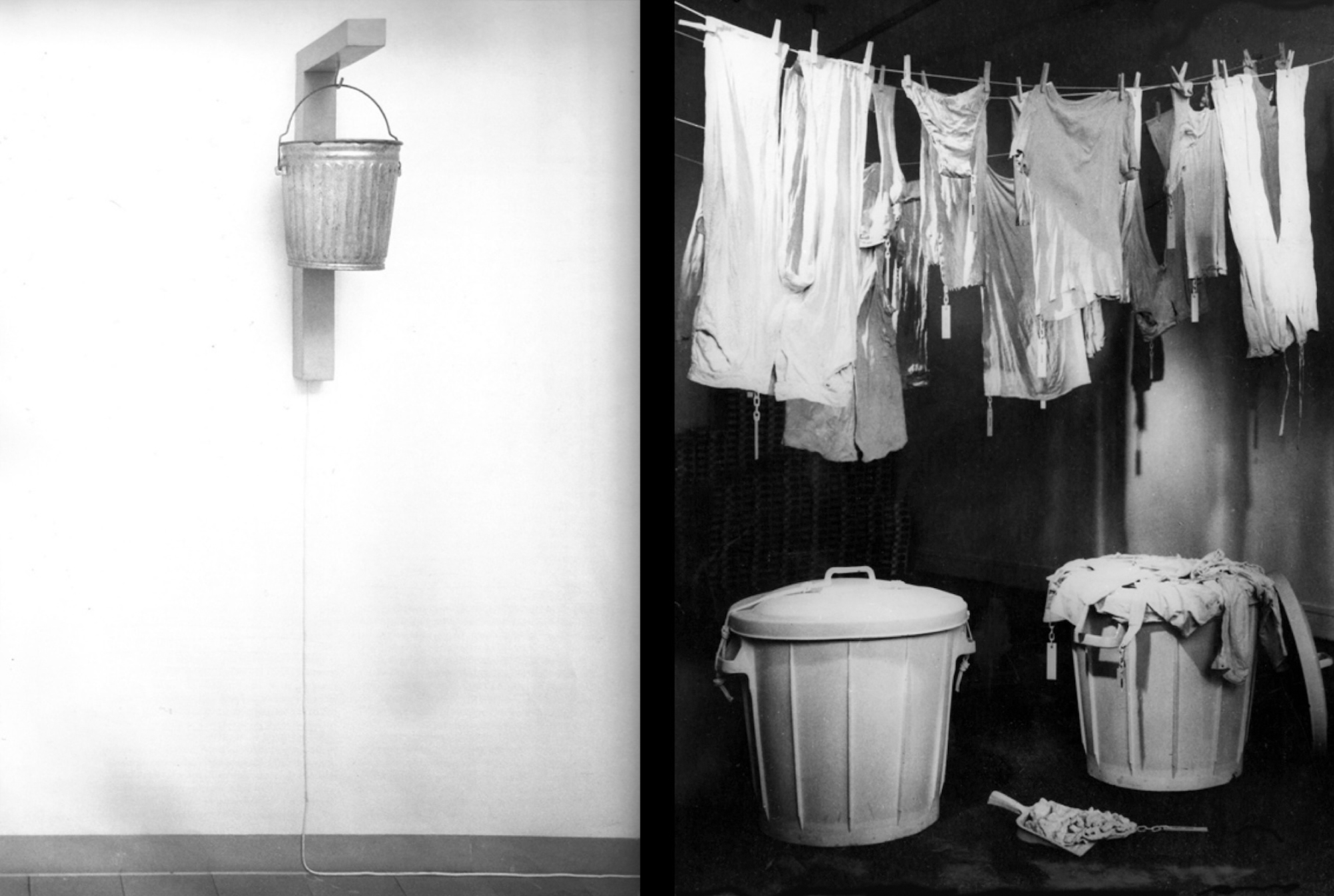 Both Journiac and Morris, used Duchamp’s concept of the “readymade” (notoriously his urinal, Fountain) for their own work: compare Morris’s elevated dustbin, Fountain (1963), and Journiac’s La Lessive (1969) with a similar fluted bin [fig. 5a & 5b]. As we know, Journiac distinguished “saved” artists — on his washing line — and the damned (Salvador Dali, Georges Mathieu) cast into the bin: the abject is represented with minimalism by Morris (is his dustbin empty?) with excess by Journiac, who dipped the clothes of the “saved” into plaster, the traditional sculptor’s material.