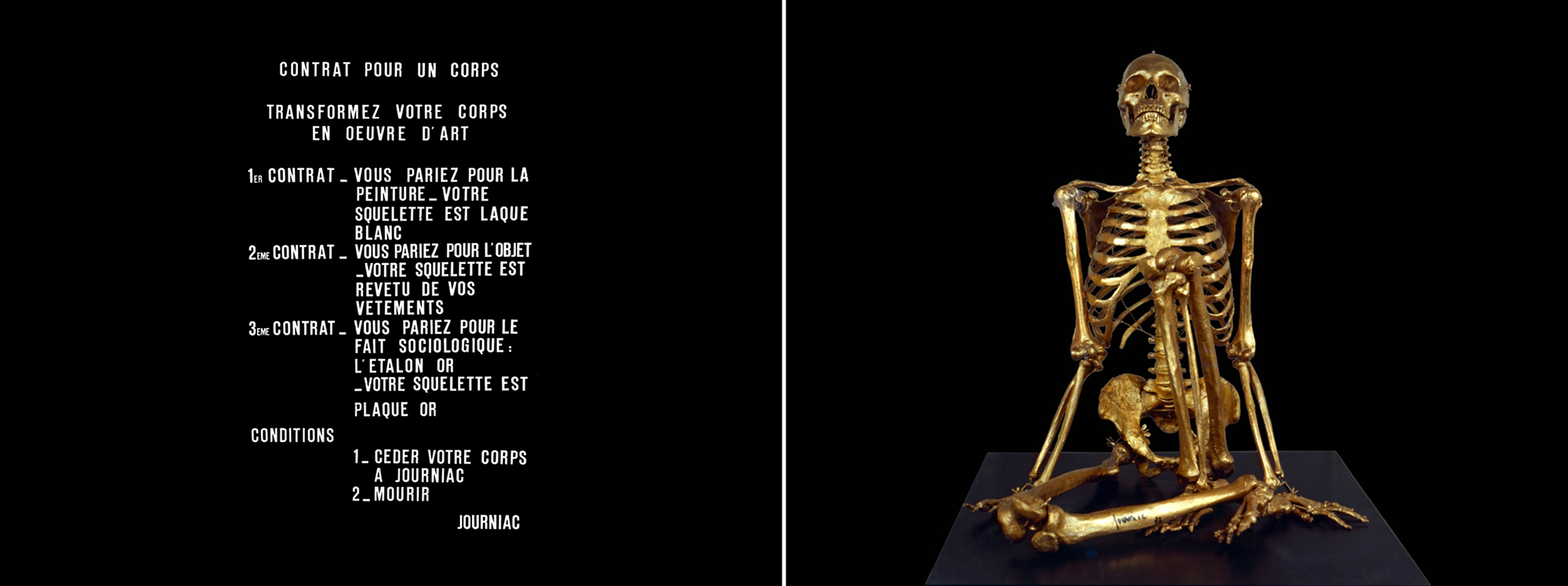 Within this increasingly entangled context, where shared fashions, music and air travel blurred philosophical and cultural distances, both Journiac and Morris turned to gold. Journiac was never entirely distanced from the trappings of the Catholic church, where the Counter-reformation gilded its message with curving, light-capturing forms. Contrat pour un corps No. 3 (1972) [fig. 10] took the notion of the conceptual art contract, and transformed the body, reduced to a skeleton, into a ready-made work of art, lacquered white for painting adepts, gold plated for the followers of l’art sociologique22. The gold skeleton, seated, one knee upright, is the artwork23.